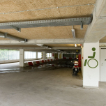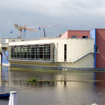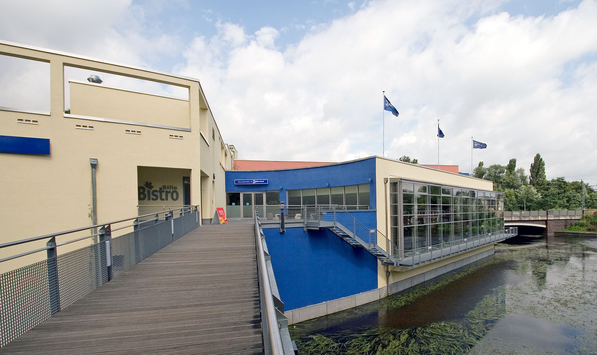 Stahlbetonskelettkonstruktion und Spannbetonbinder, aussteifende Trh.-Kerne, Weisse Wanne, Pfahlgründung, Brücke über die Bille in Holz-Elementbauweise