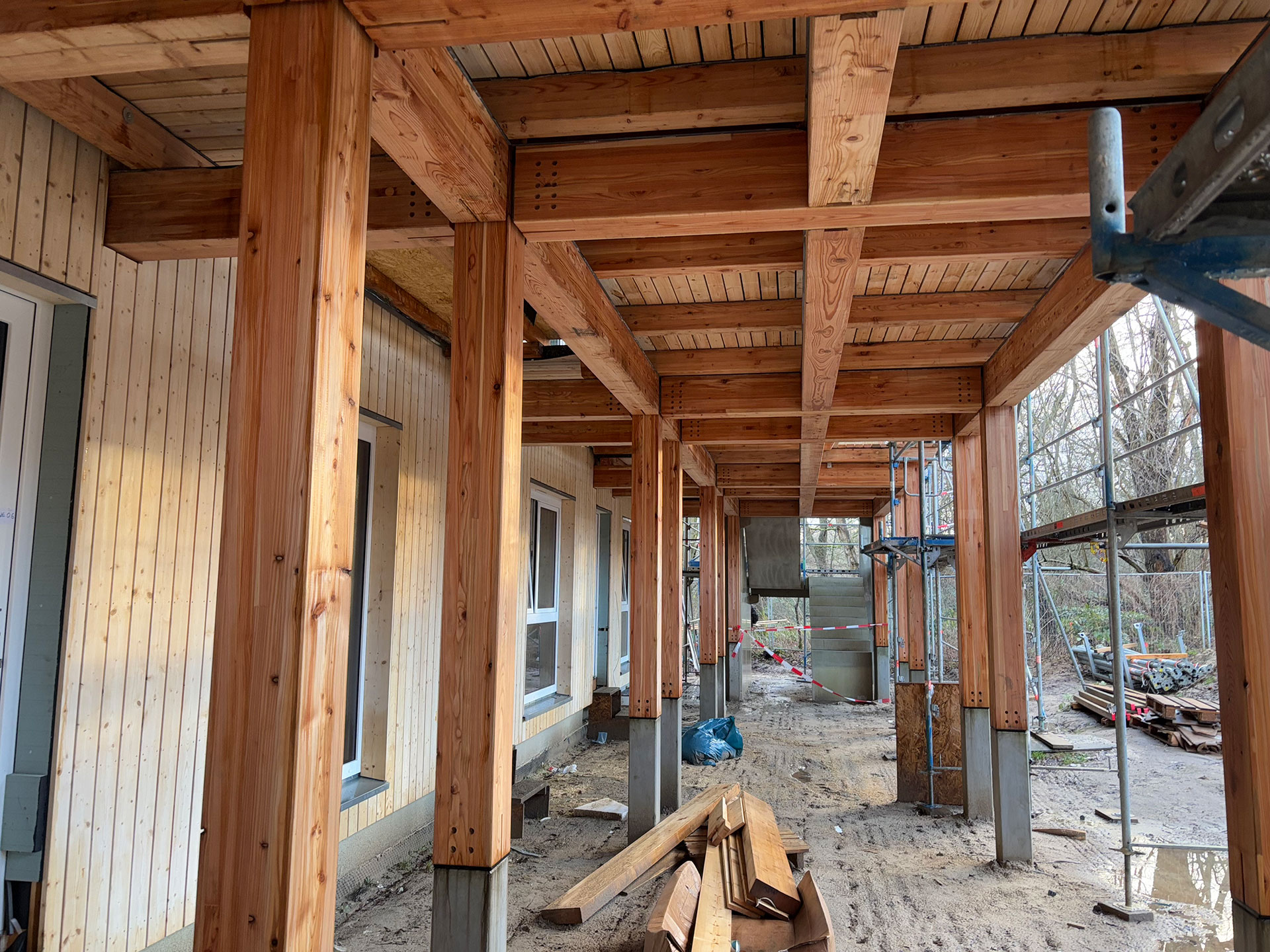 Bei dem Bauvorhaben handelt es sich um den Neubau von zwei Mehrfamilienhäusern mit jeweils drei Obergeschossen in Holzbauweise. Hierbei kommen Brettsperrholzdecken in Verbindung mit Brettsperrholz- und Holzrahmenbauwänden zum Einsatz. Das östliche Gebäude ist mit einem Stahlbetonkeller versehen, welcher in WU-Bauweise erstellt wird. Die Gebäude sind flach gegründet.