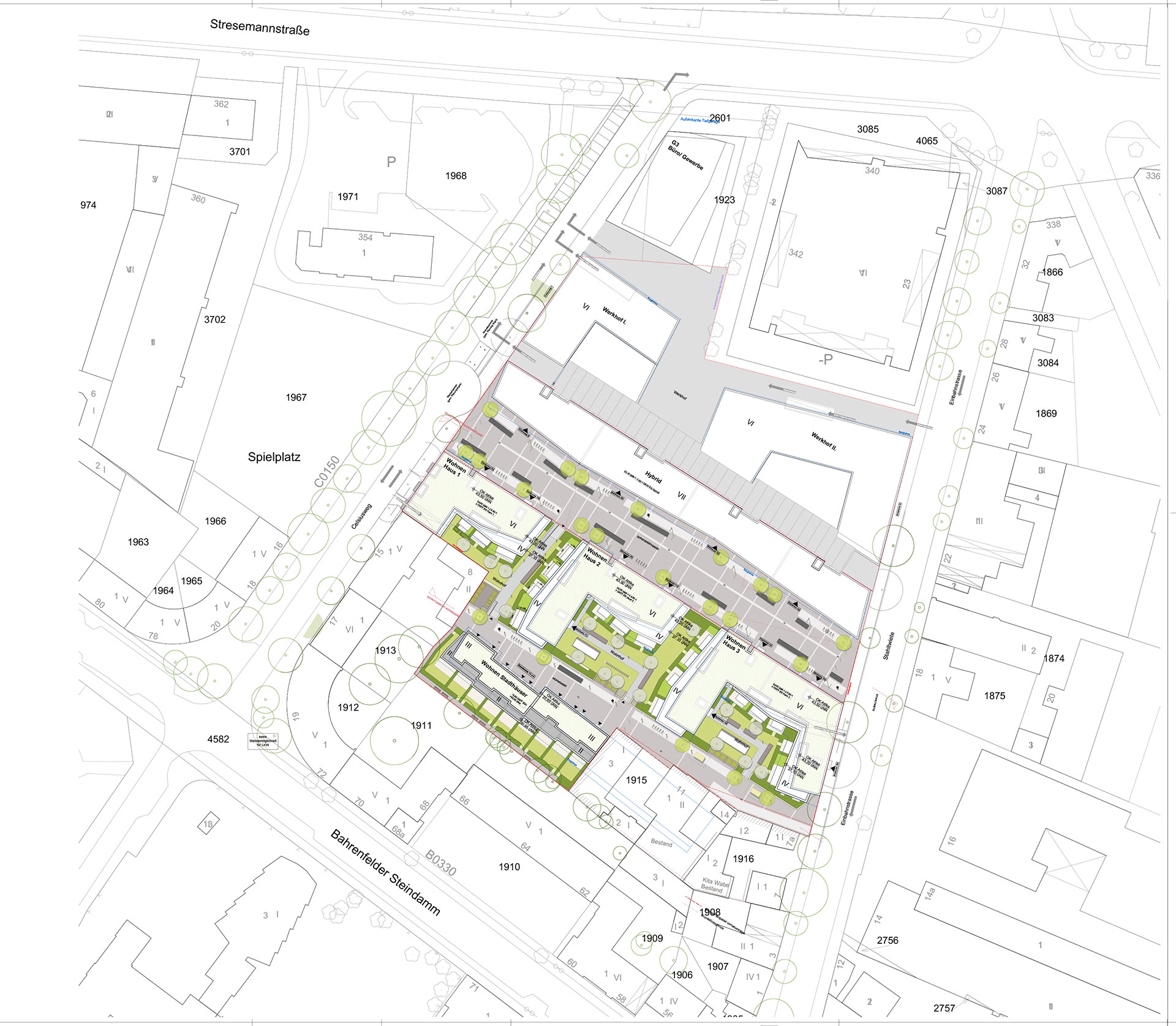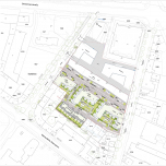 Neubau von 3 Mehrfamilienhäusern, 4 Hybridgebäuden (Wohnen, KiTa, Gewerbe und Büro) und 9 Stadtreihenhäusern, Quartiersgarage (unter allen Gebäuden und Freiflächen). Massivbauweise.