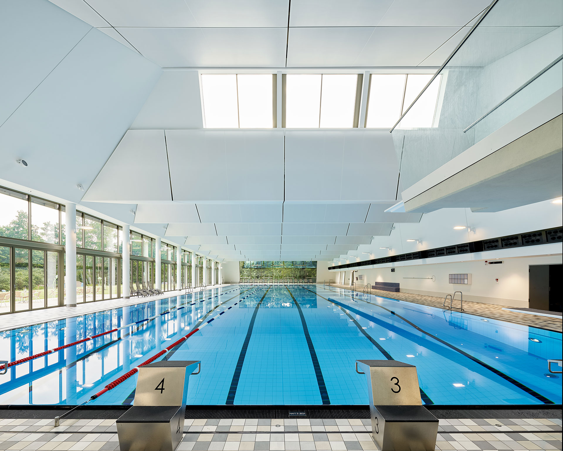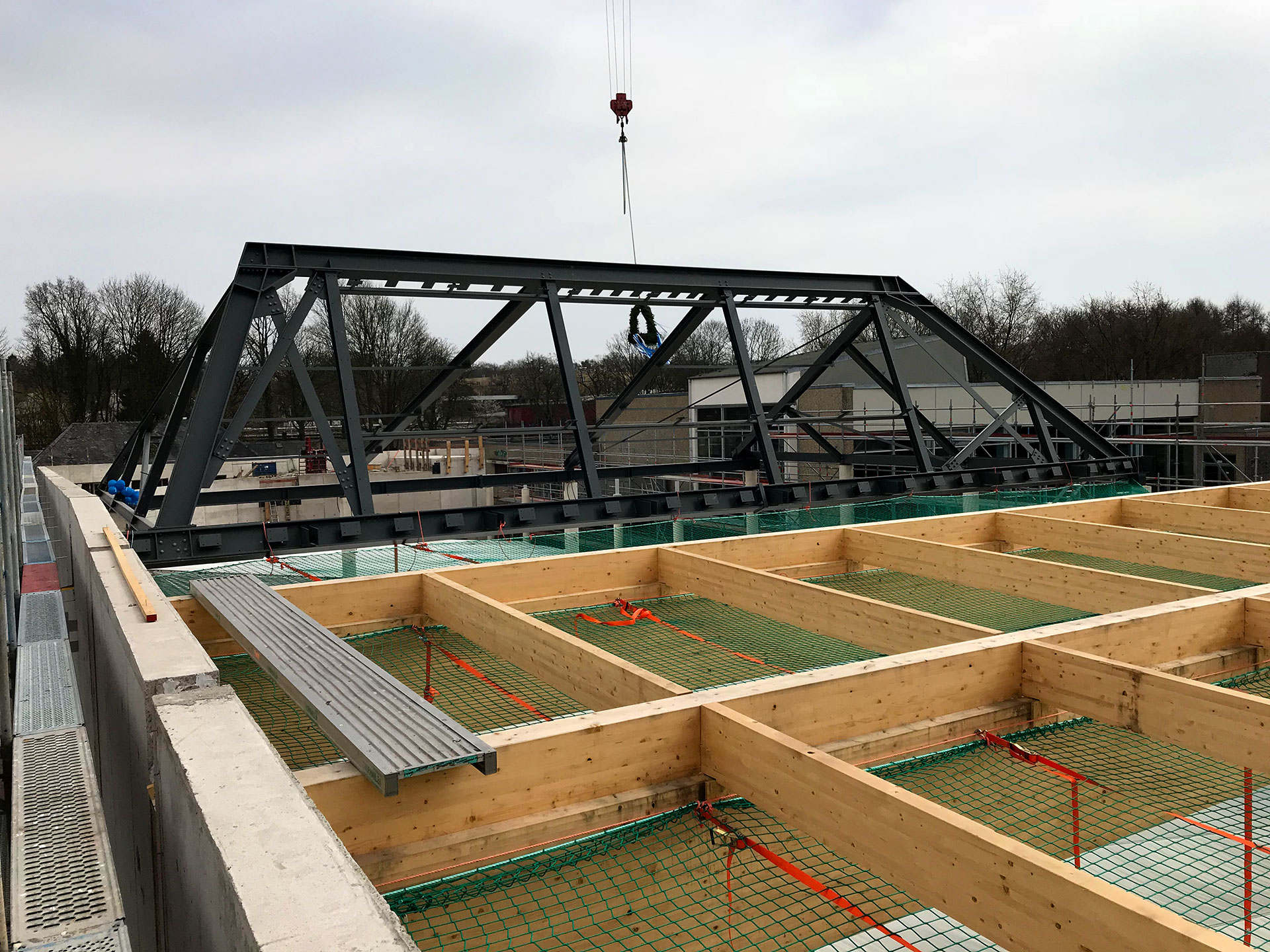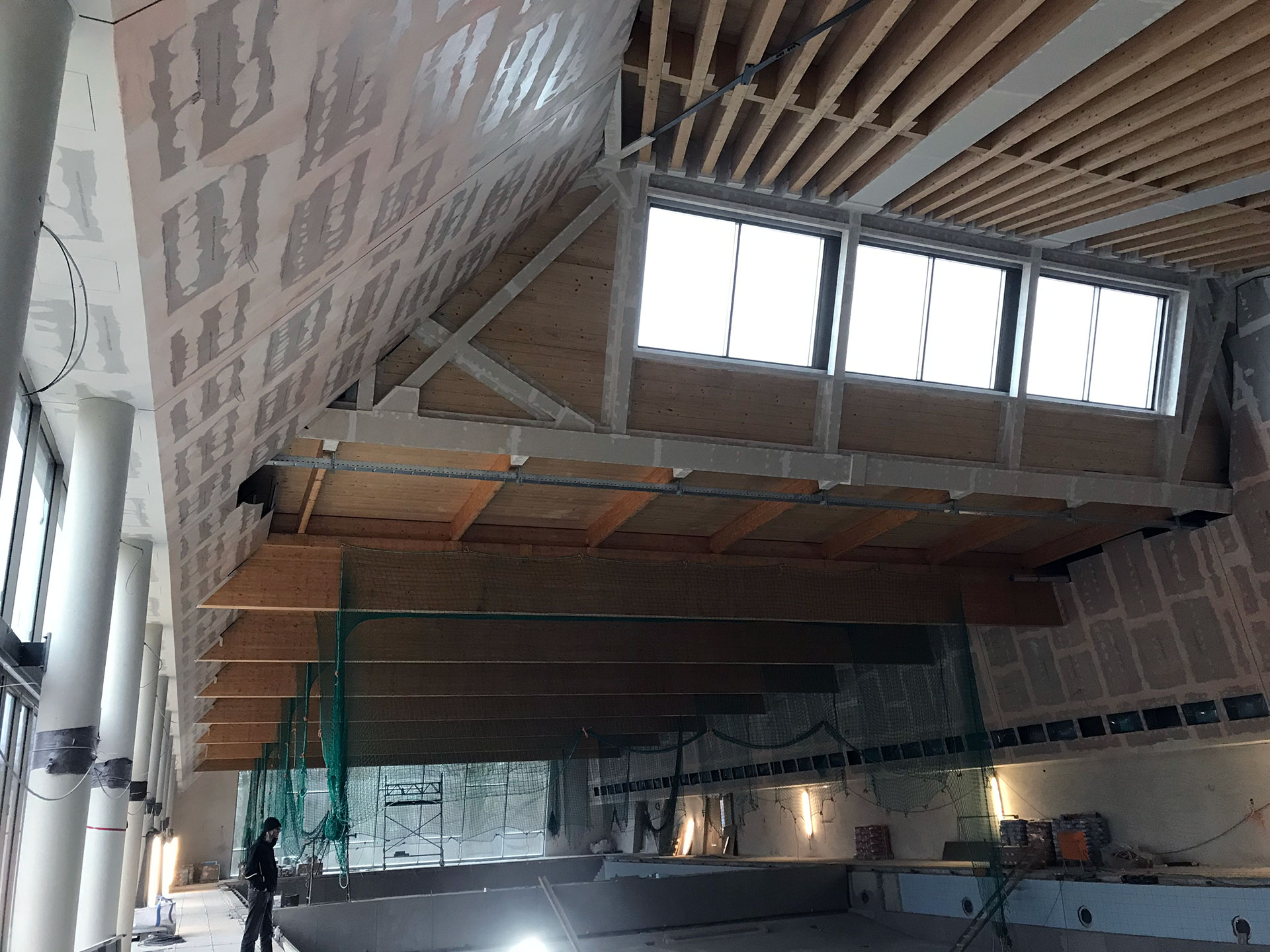Dachtragwerk mit BSH-Bindern (h = 1,85 m, Spannweite 23,50 m), Dachscheibe aus Brettsperrholz, Becken und Kellerkasten in WU-Beton, Flachgründung (Baugrundverbesserung mit Rüttelstopfsäulen)
