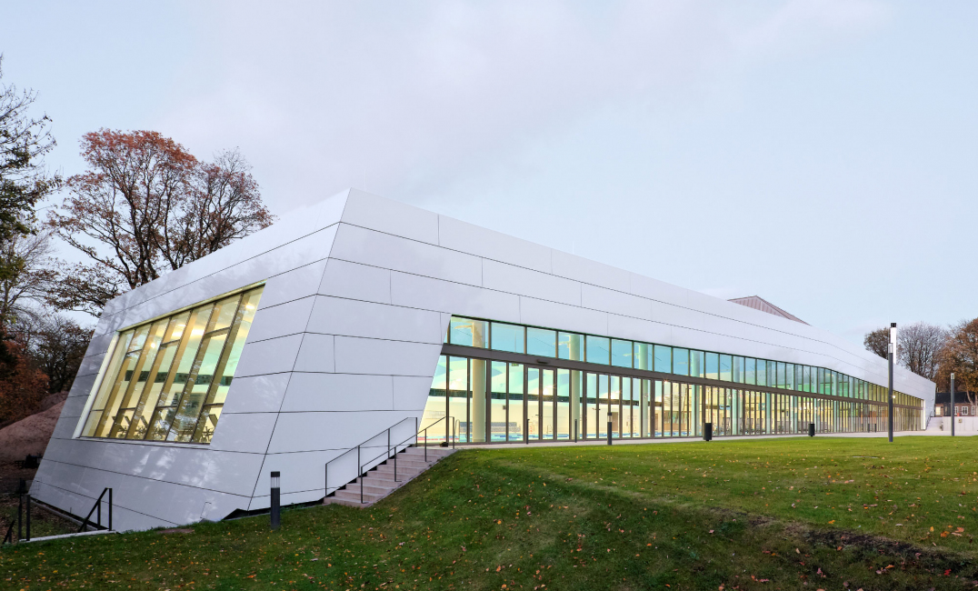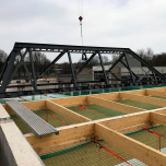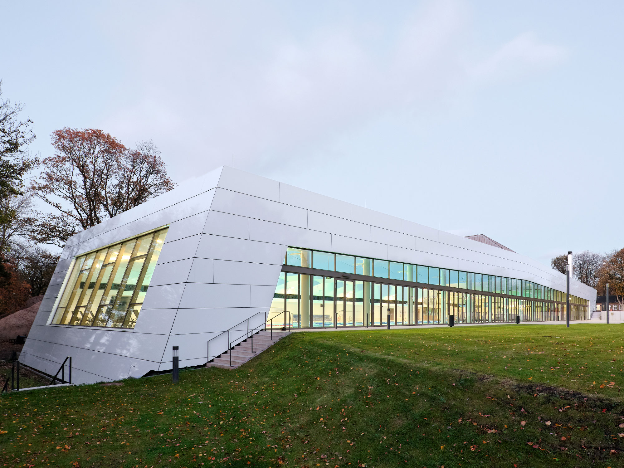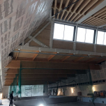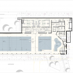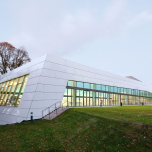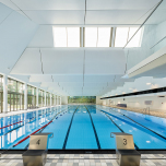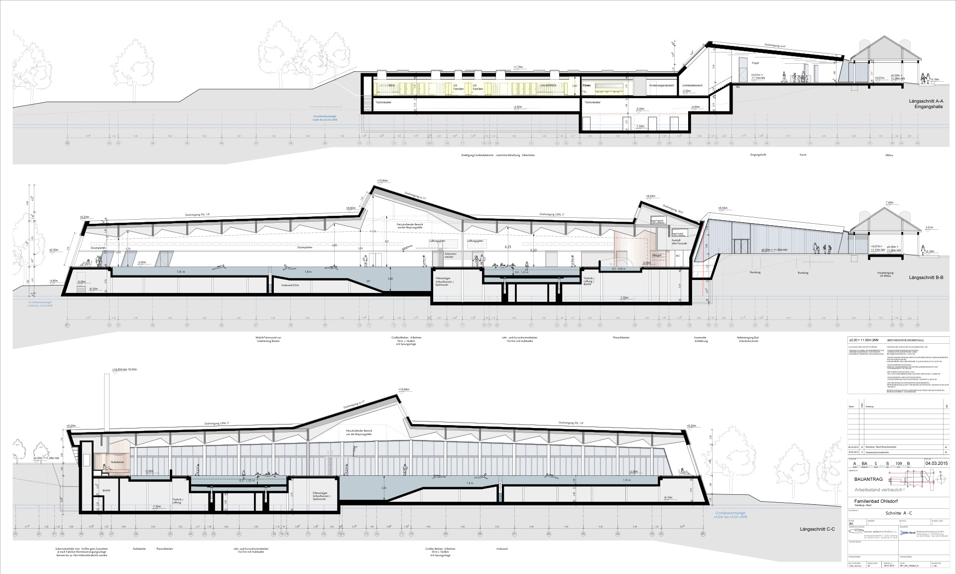 Dachtragwerk mit BSH-Bindern (h = 1,85 m, Spannweite 23,50 m), Dachscheibe aus Brettsperrholz, Becken und Kellerkasten in WU-Beton, Flachgründung (Baugrundverbesserung mit Rüttelstopfsäulen)