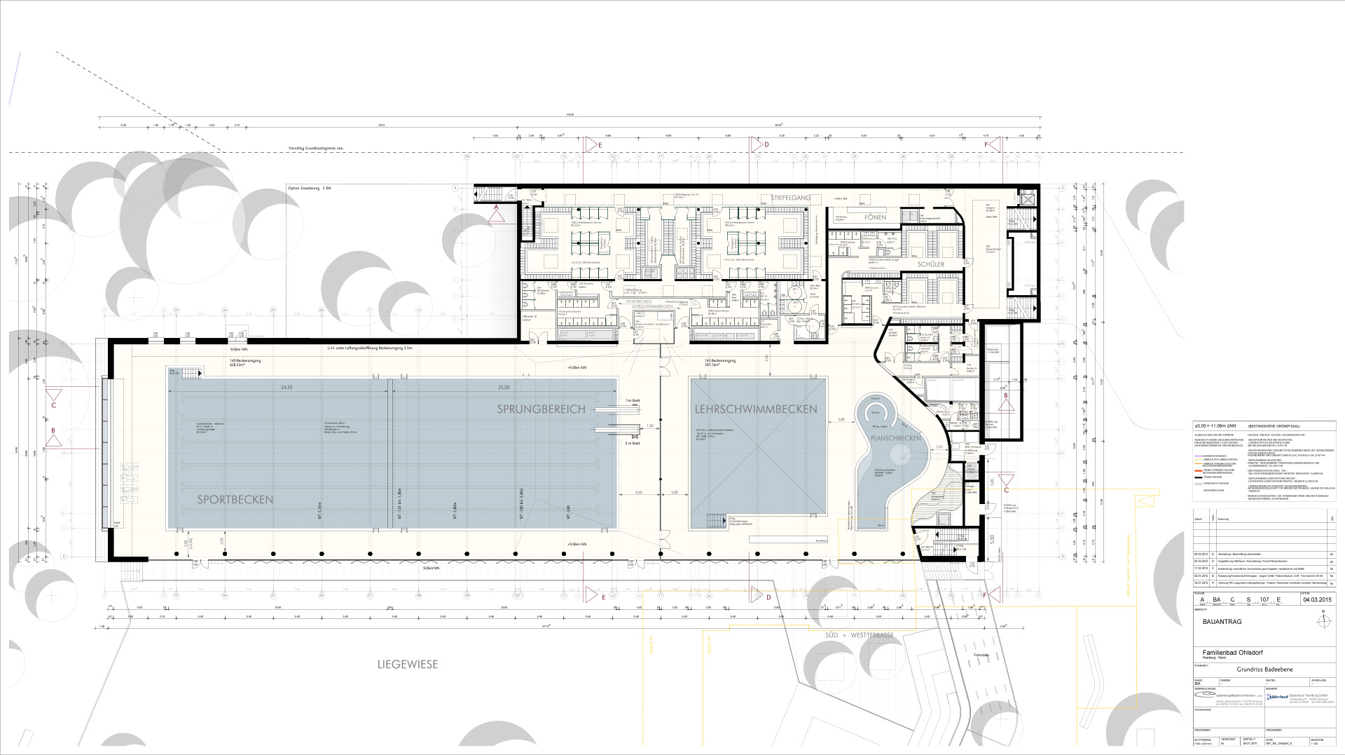 Das auf dem Grundstück vorhandene und auf Rammpfählen gegründete Hallenbad (errichtet ca. 1960) wurde vollständig abgebrochen. Aufgrund der direkten Nähe zum Neubau und des schlechten Bauzustandes des Altbaus mussten diverse Schnittstellen, wie z. B. vorgezogene Teilabbrüche, Hilfsabstützungen und Baugrubensicherungen bearbeitet und von unseren Ingenieuren örtlich betreut werden.