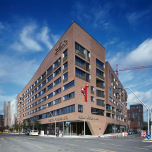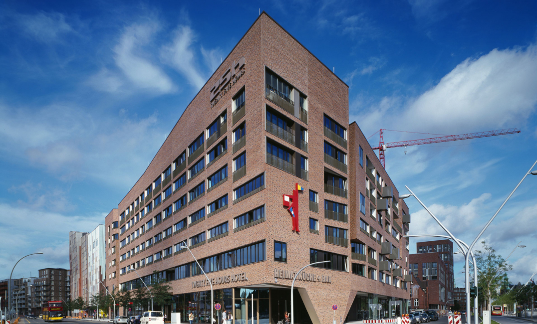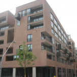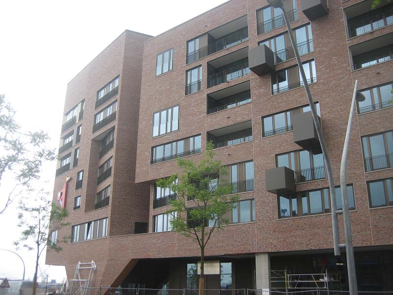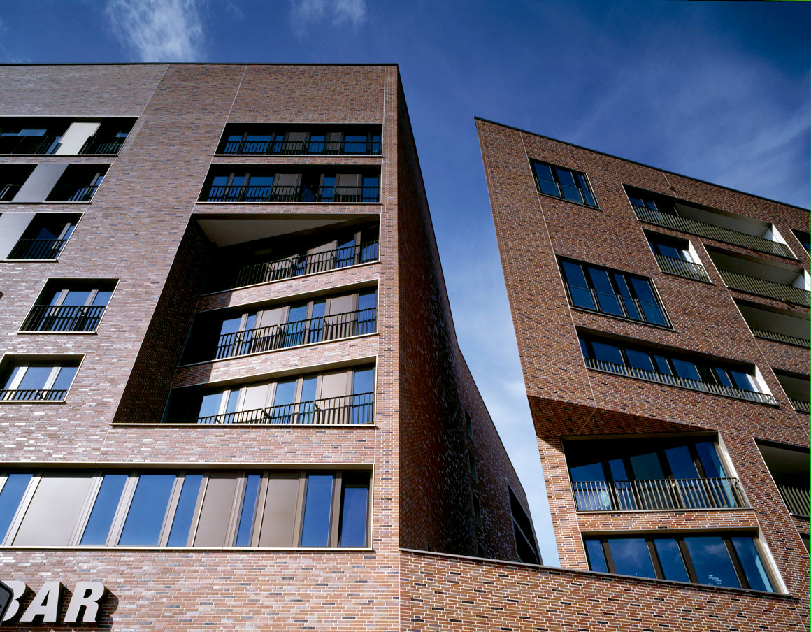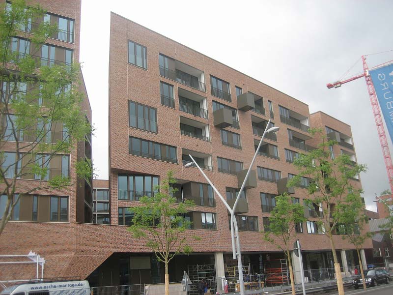Neubau von drei Mehrfamilienhäusern mit Gewerbeeinheiten im Erdgeschoss und einem Hotel mit sieben Obergeschossen. Alle Gebäude stehen auf einem gemeinsamen durchgehenden Sockelgeschoss Die Grundabmessungen betragen in etwa 70 m x 70 m.