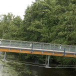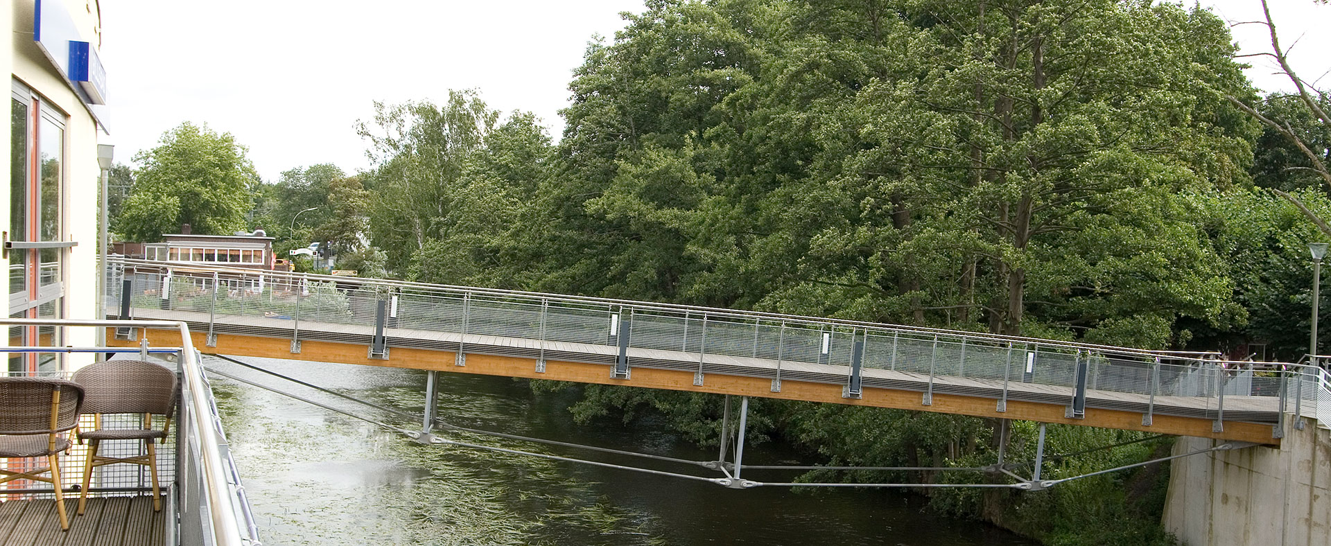 Stahlbetonskelettkonstruktion und Spannbetonbinder, aussteifende Trh.-Kerne, Weisse Wanne, Pfahlgründung, Brücke über die Bille in Holz-Elementbauweise