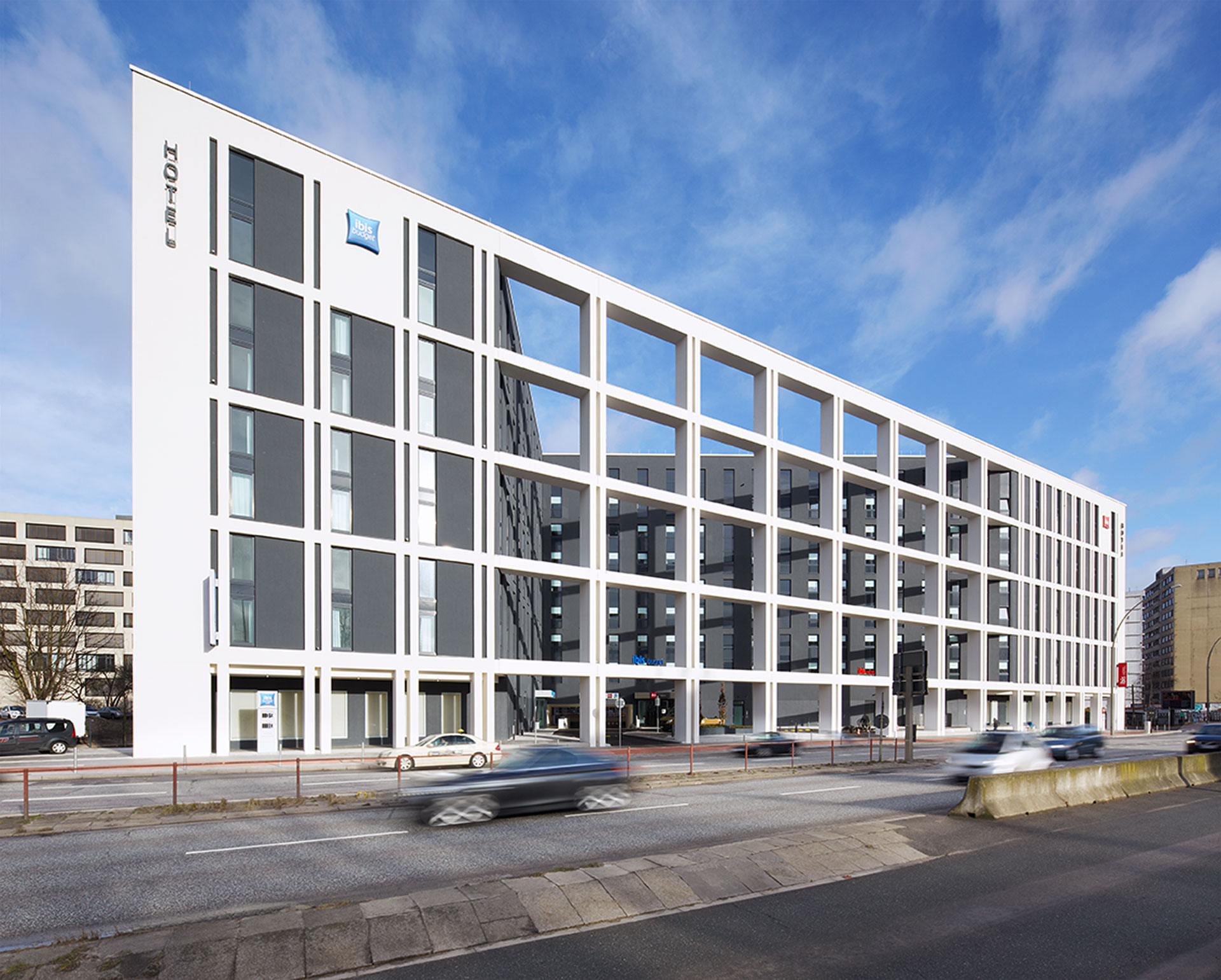 Für das markante achtgeschossige Gebäude wurde eine geschlossene Bauweise zur Amsinckstraße hin gefordert. Dementsprechend wurde ein offenes Fassadengitter („Grid“) errichtet.